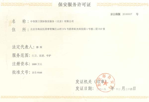 中保國衛(wèi)國際保安服務(北京)有限公司,屬中保國衛(wèi)集團旗下子公司。能全方位的為大型客戶提供優(yōu)質的安保、押運服務,是集人防和技防于一體的新型正規(guī)化綜合安保押運服務企業(yè),提供人防、物防、技防、聯(lián)網(wǎng)報*、非武裝押運等安防相關的一站式服務。 公司在國內多省設立有分公司及分支機構,著重提升安全押運、智能技術押運及安全技術防范相關的服務,業(yè)務范圍覆蓋全國一、二線城市、港澳地區(qū)以及海外地區(qū)。安保方面主要為政府機構、金融機構、企事業(yè)單位、醫(yī)療衛(wèi)生、高等院校、工業(yè)園區(qū)、大型商場、高檔住宅、智能商務樓、大型活動提供門衛(wèi)、守護、巡邏、押運(非武裝)、安全檢查、保安特勤、私人護衛(wèi)、消防中控、安全技術防范、遠洋護航等全方位服務,同時面向國際市場,為中資企業(yè)在“一帶一路”沿線國家投資提供境外安保服務。 >> 更多內容 |